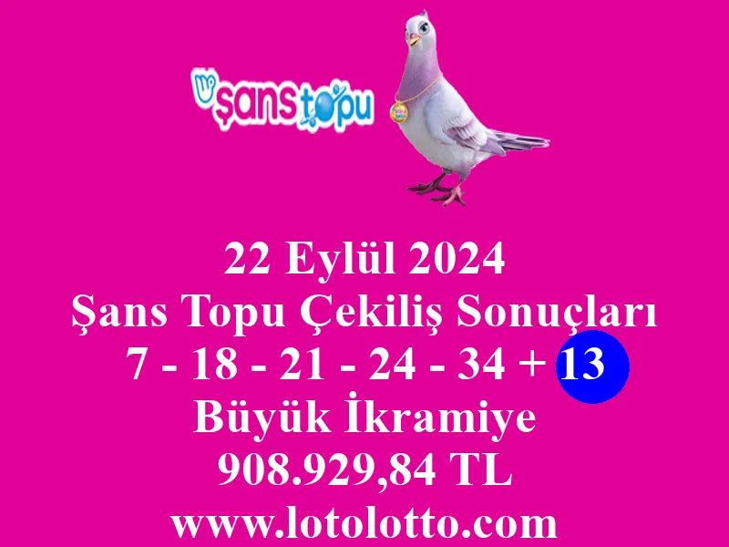 24 Ağustos 2025 Şans Topu Çekiliş Sonuçları Şans Topu Çekiliş Detayları: Kazanan Numaralar 8–10–13–19–22 + 9 Çekiliş No: 202568 Kategori